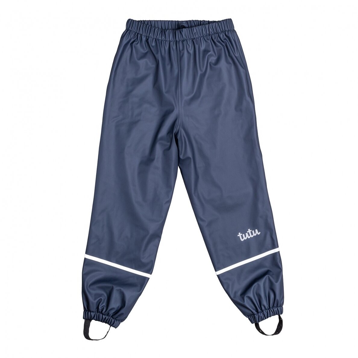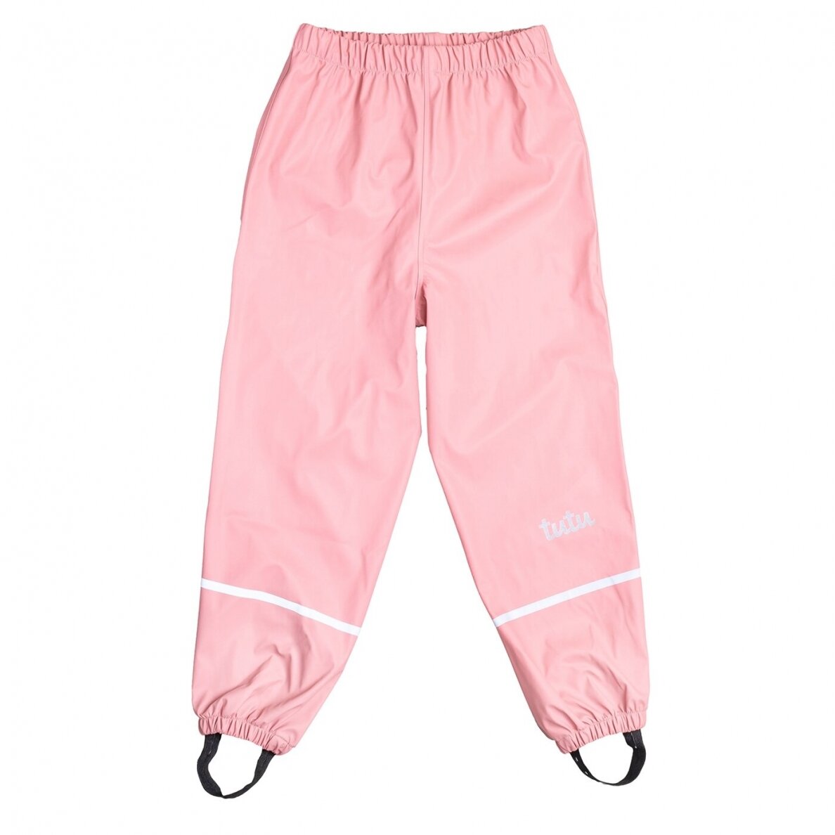 A.T.H. Í stærð 146-152 eru regnbuxurnar flísfóðraðar og með teygju í mittið, en ekki með axlaböndum.
